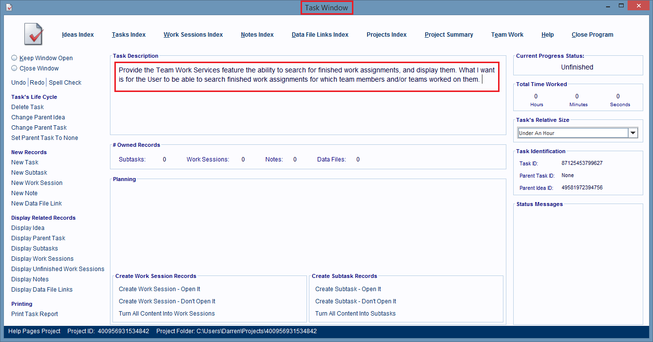 The Ideas Window is primarily used to edit Idea records, create child records for them, and display