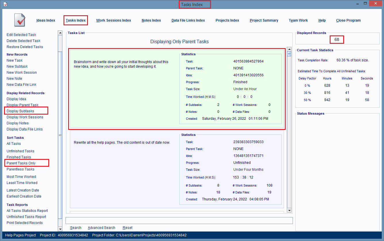 The image below shows a parent Task record selected in a Tasks Index Window.